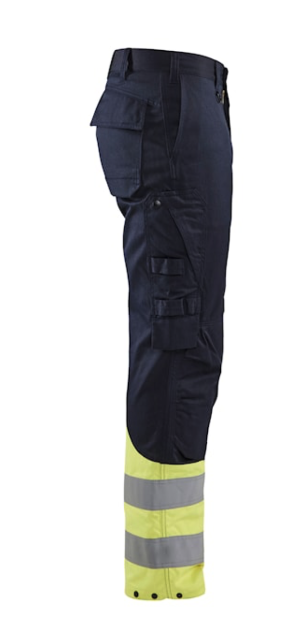 Eine flammhemmende Arbeitshose in der Qualität 1519 mit einem inhärenten Stoff der Klasse E3, der speziell für Arbeiten in der Metallindustrie entwickelt wurde bei denen mit geschmolzenem Eisen gearbeitet wird. Die Klasse 1 highvis-zertifizierte Arbeitshose schützt vor Spritzern von geschmolzenem Metall und vor Strahlungshitze. Diese öl-, schmutz- und wasserabweisende Hose hat eine verstellbare Beinweite durch einen Druckknopf am Knöchel, eine Beintasche mit Patte auf der linken Seite und Ausweishalter. Sie besitzt außerdem einen Messerhalter, eine Handytasche, Zollstocktasche und Gesäßtaschen mit Patten. Getestet für Industriewäsche. Zertifiziert nach EN ISO 20471, EN 1149-5, EN13034, EN ISO 11612, EN ISO 11611, IEC 61482-2, EN 14404, ATPV: 14 cal/cm², ELIM: 12 cal/cm².